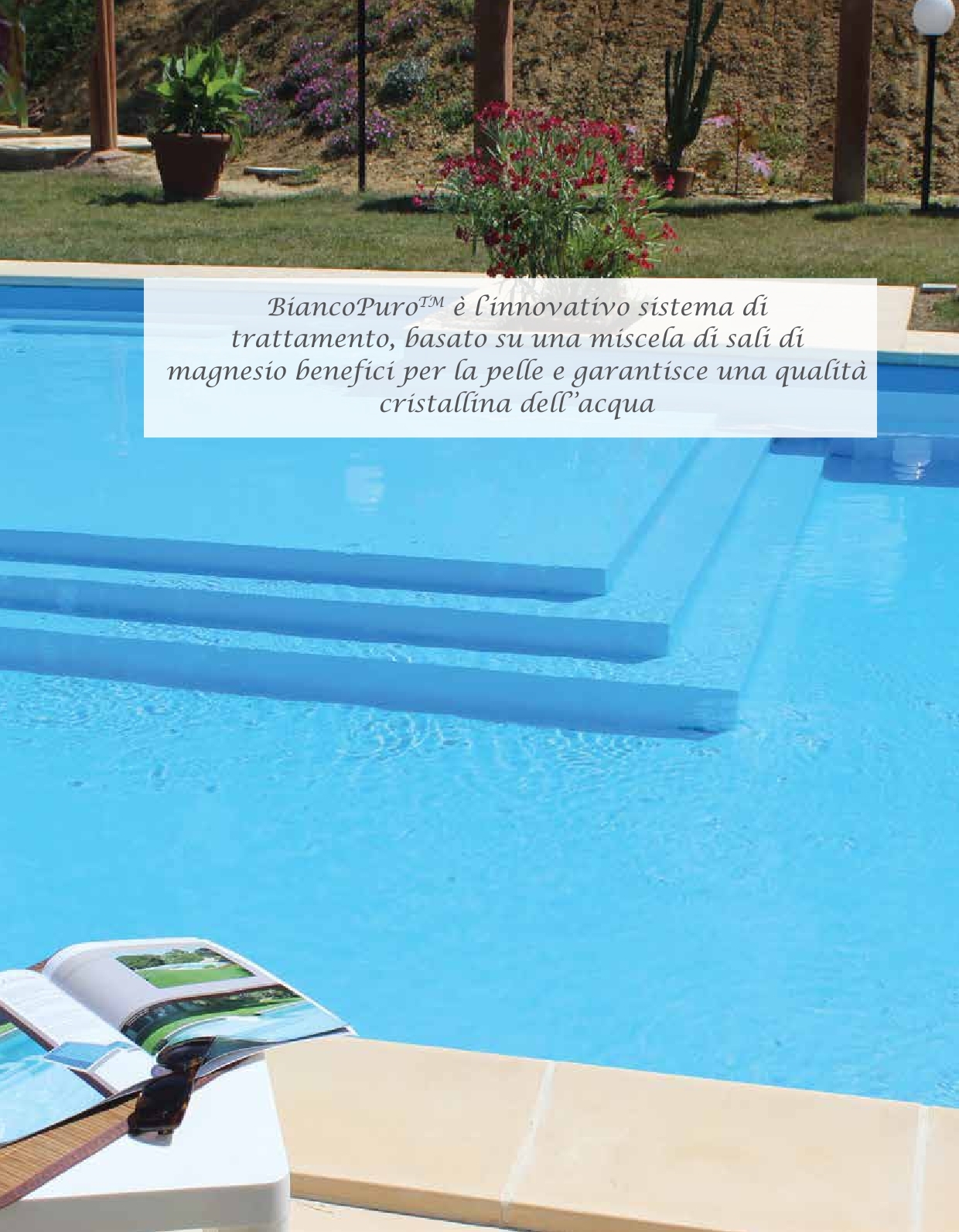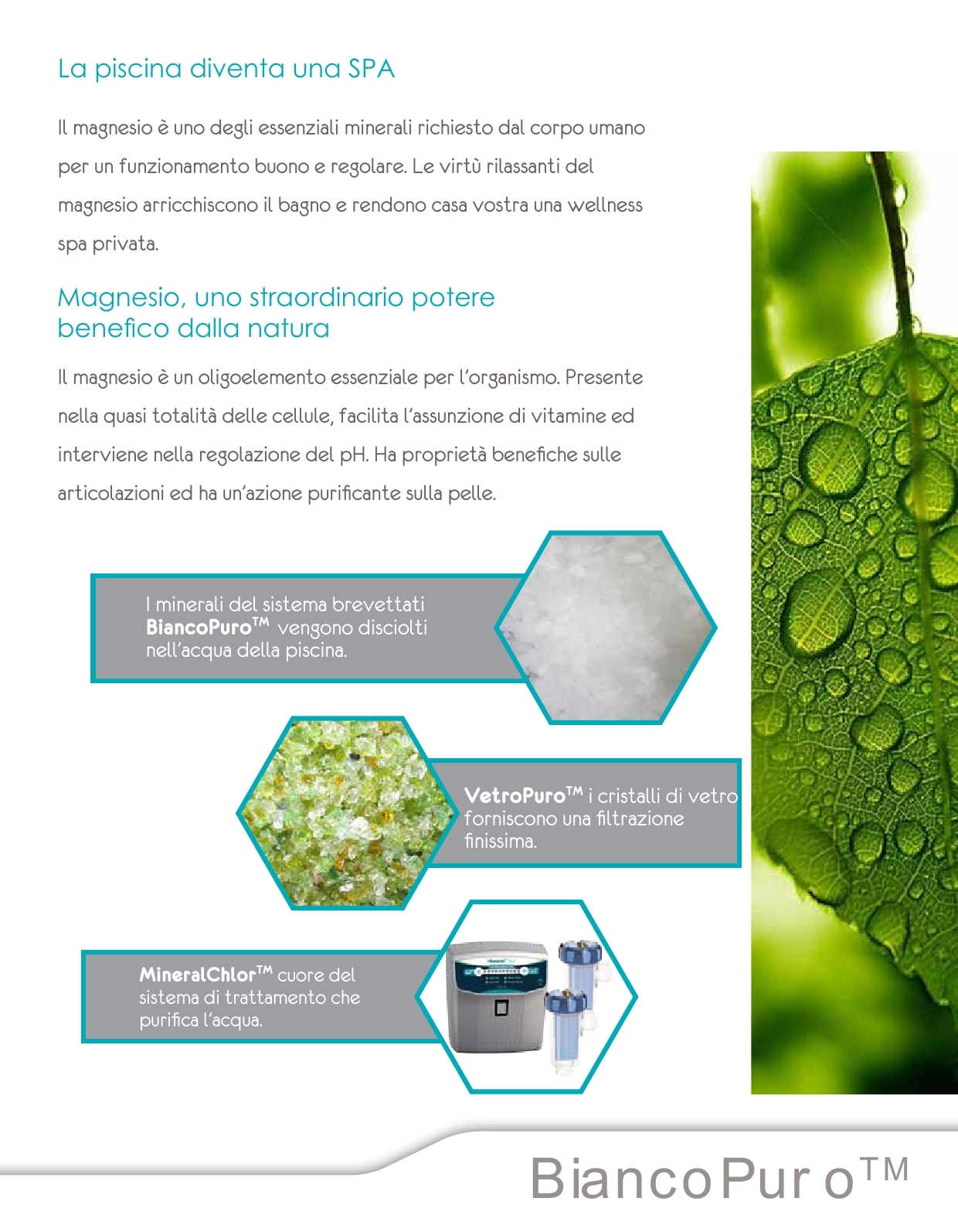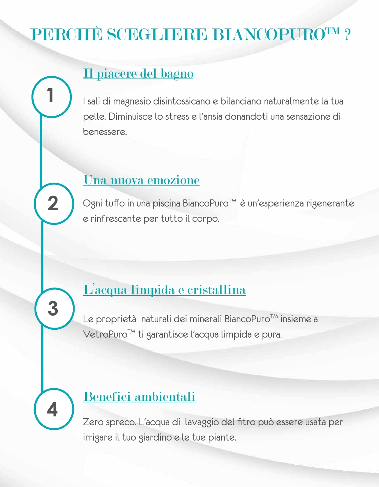 BiancoPuroTM è l’innovativo sistema di trattamento, basato su una miscela di sali di magnesio benefici per la pelle e garantisce una qualità cristallina dell’’acqua.