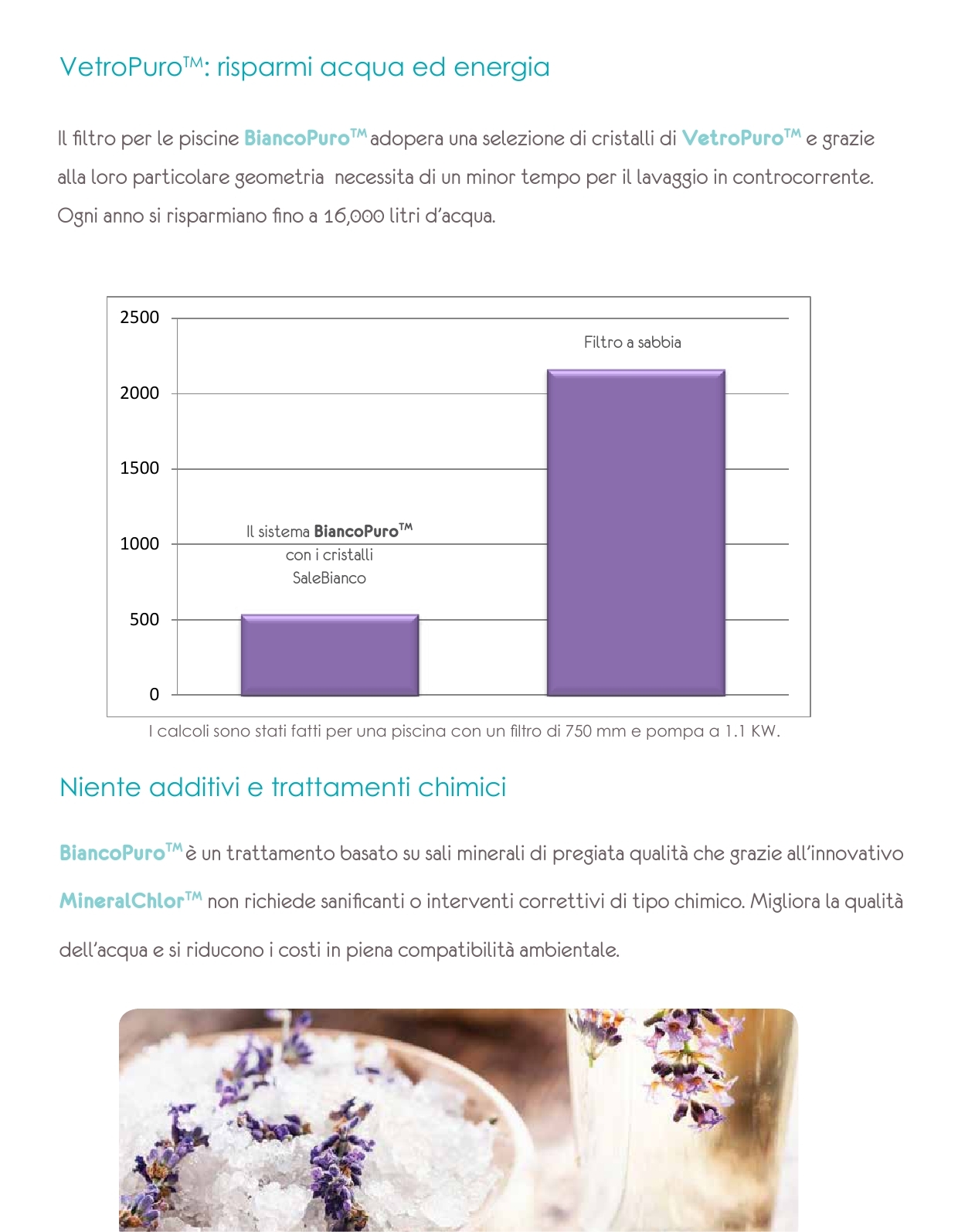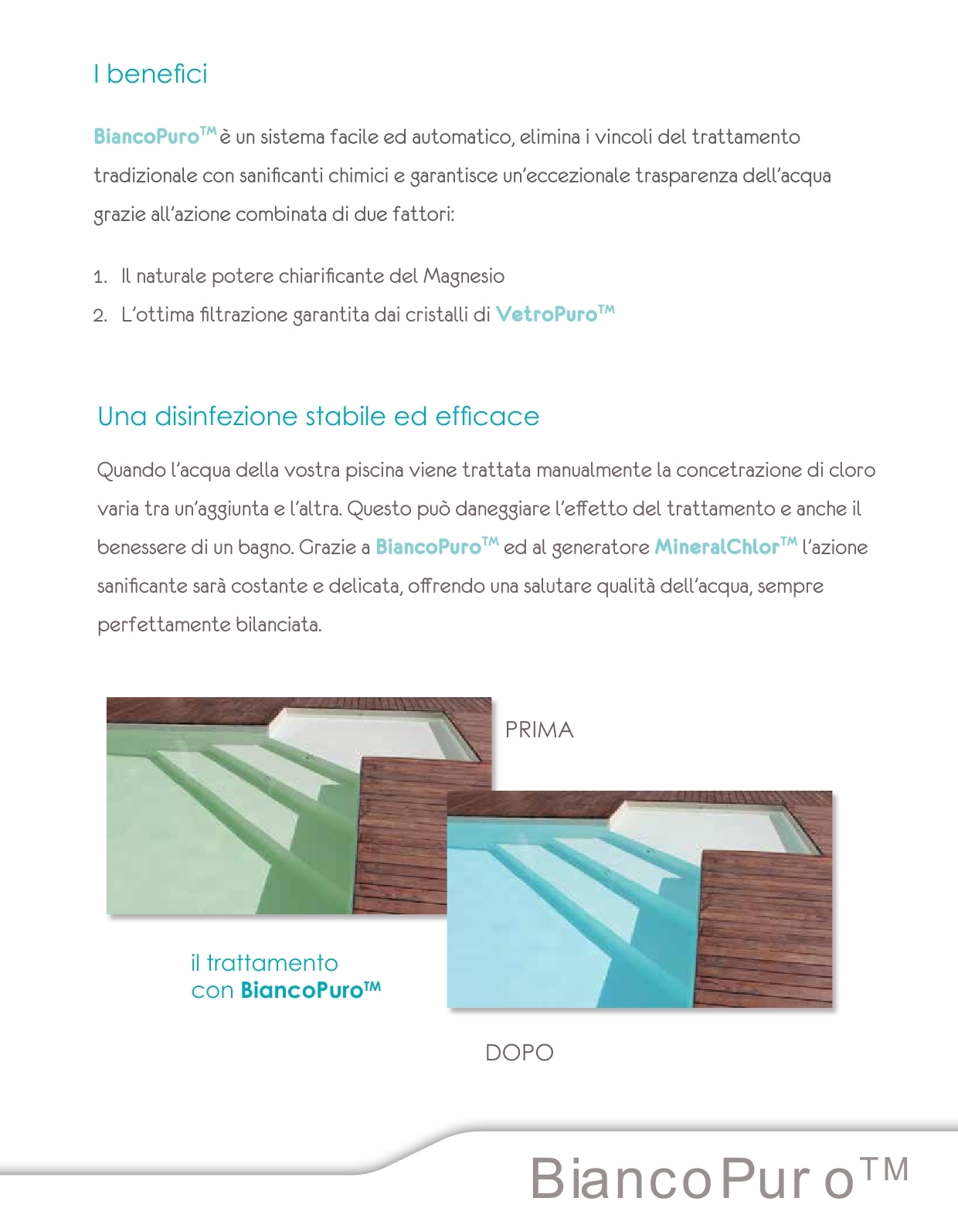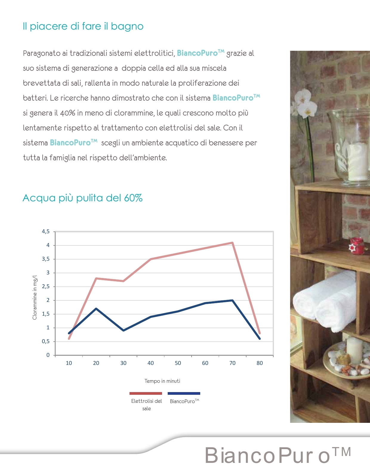 BiancoPuroTM è l’innovativo sistema di trattamento, basato su una miscela di sali di magnesio benefici per la pelle e garantisce una qualità cristallina dell’’acqua.