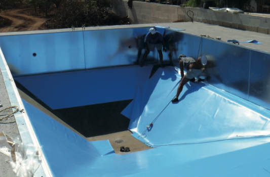 Rivestimento vinilico in PVC armato internamente con fibra di Trevira, spessore mm. 1,5 colore azzurro, che forma una vasca impermeabile in blocco unico completamente indipendente dalla struttura di base.